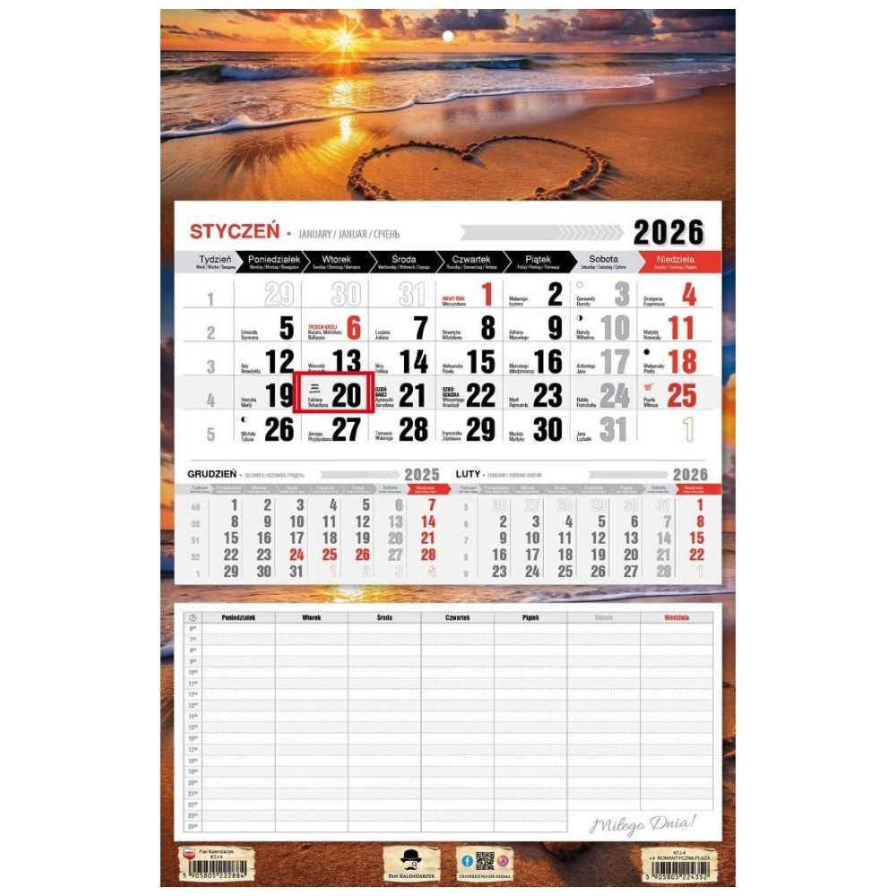 Kalendarz 2026 jednodzielny z planem zajęć plaża