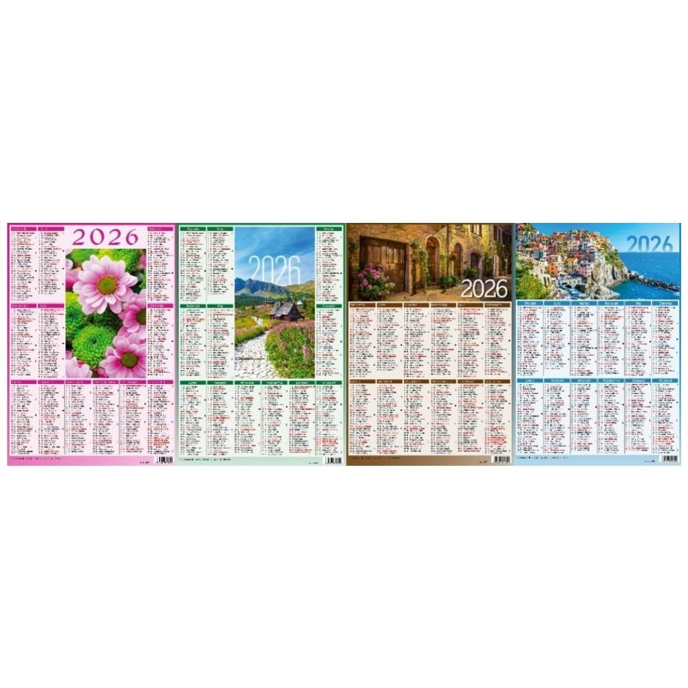 Kalendarz wiszący ścienny jednoplaszowy w formacie A4 z kalendarium w układzie rocznym. Kalendarium zawiera imieniny, święta państwowe i religijne oraz fazy Księżyca.