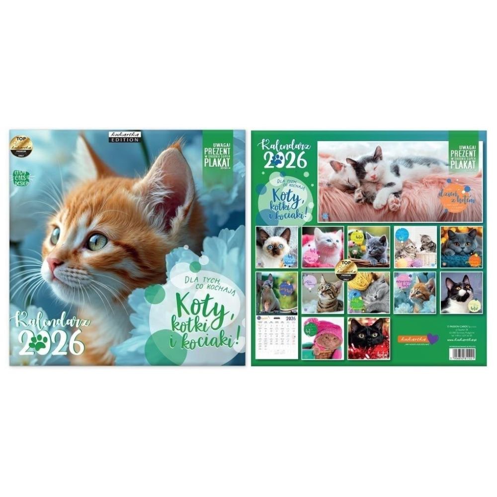 Kalendarz 2026 Koty, kotki i kociaki Kwadratowy kalendarz ścienny na rok 2026 z serii "Koty, kotki i kociaki". Każdy miesiąc przyozdabia zdjęcie kociaka, który będzie wspaniałą ozdobą Waszego domu. Taki kalendarz to idelany prezent dla miłośników kotów. Kalendarz po rozłożeniu ma wymiary 30×60 cm – górny kwadrat wypełnia zdjęcie, a dolny kalendarium. PREZENT: na środku kalendarza znajdziecie plakat ze zdjęciem kociaka o wymiarach 30x 60 cm Specyfikacja: Wielkość: 30 x 30 cm (po rozłożeniu 30 x 60 cm) Gratis: plakat Styl: cytaty, nowoczesny, klasyczny, zdjęciowy