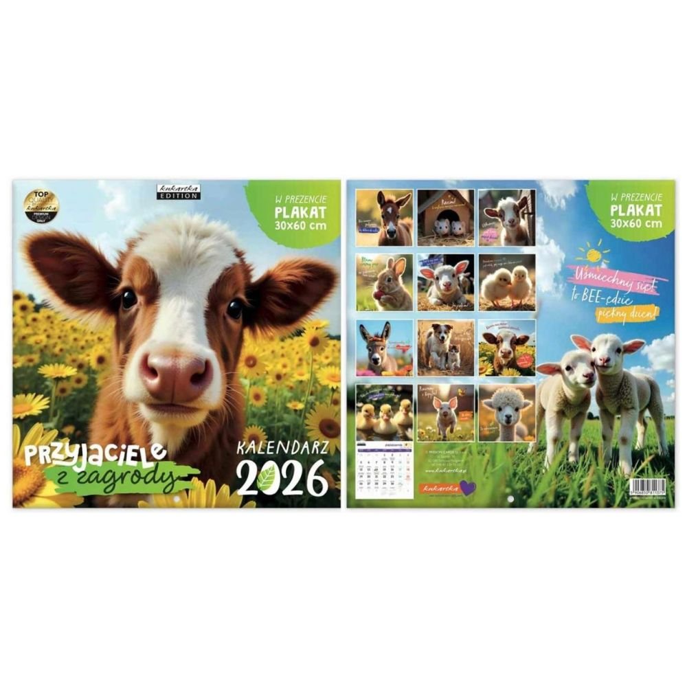 Kalendarz 2026 Przyjaciele z zagrody Kwadratowy kalendarz ścienny na rok 2026 Przyjaciele z zagrody Każdy miesiąc cieszy zabawnym zdjęciem zwierząt hodowlanych oraz humorystycznym powiedzonkiem. Kalendarz po rozłożeniu ma wymiary 30×60 cm – górny kwadrat wypełnia zdjęcie, a dolny kalendarium. PREZENT: w środku kalendarza znajdziecie plakat o wielkości 30x 60 cm! Specyfikacja: Wielkość: 30 x 30 cm (po rozłożeniu 30 x 60 cm) Gratis: plakat Styl: cytaty, nowoczesny, klasyczny, zdjęciowy
