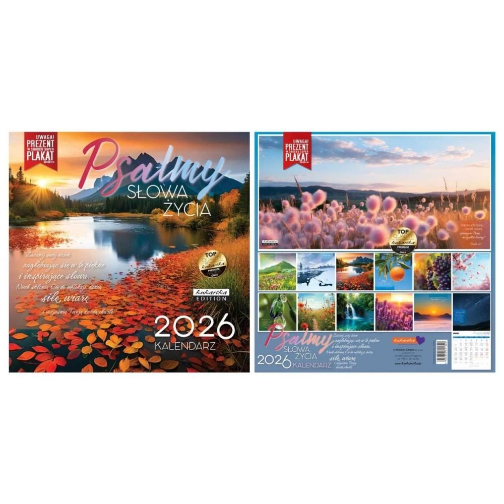 Kalendarz 2026 Psalmy Słowa życia Kwadratowy kalendarz ścienny na rok 2026 z serii "Psalmy Słowa życia". Każdy miesiąc cieszy pięknym zdjęciem oraz sentencją wprawiającą w lepszy nastrój. Taki kalendarz to idealny prezent na Mikołaja lub pod choinkę, trudno też lepiej zacząć rok!! Kalendarz po rozłożeniu ma wymiary 30×60 cm – górny kwadrat wypełnia zdjęcie, a dolny kalendarium. PREZENT: w środku kalendarza znajdziecie plakat ze zdjęciem o wielkości 30x 60 cm Specyfikacja: Wielkość: 30 x 30 cm (po rozłożeniu 30 x 60 cm) Gratis: plakat Styl: cytaty, nowoczesny, klasyczny, zdjęciowy