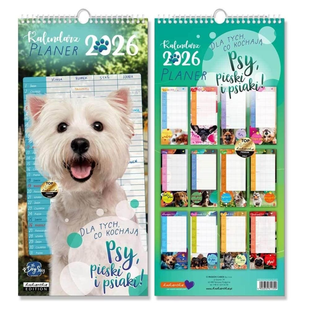 Planer 2026 Psy, pieski i psiaki Podłużny kalendarz ścienny na rok 2026 z najpiękniejszymi pieskami. Każdy miesiąc cieszy pieknym zdjęciem psa, która będzie wspaniałą ozdobą Waszego domu. Planer PSY pozwoli być na bieżąco ze wszystkimi zajęciami każdego członka rodziny (podział na 4 osoby) – wszystkie treningi piłkarskie, zajęcia językowe, urodziny, wspólne wyjazdy – nic Cię już nie zaskoczy 🙂 Taki kalendarz to idealny prezent dla miłośników psów Specyfikacja: Wielkość: 21 x 45 cm Kalendarium: można po nim pisać Styl: cytaty, nowoczesny, klasyczny, zdjęciowy