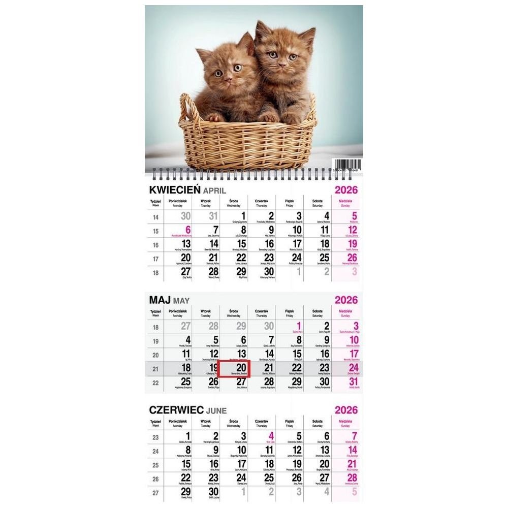 Kalendarz 2026 trójdzielny na spirali Koty