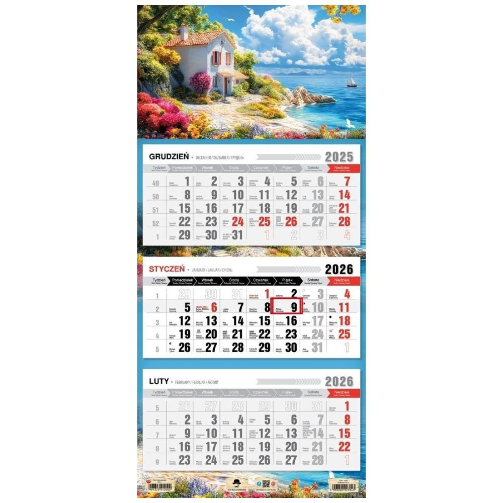 Kalendarz 2026 TRÓJDZIELNY PŁASKA GŁÓWKA. Format 315/680mm. Trzy komplety klasycznych kalendariów z przesuwnym okienkiem. Główka wypukła z otworem wierconym. Dodatkowo nazwy miesiąca i dni tygodnia w języku Ukraińskim, Angielskim i Niemieckim. Kalendarium dodatkowo zawiera fazy księżyca i znaki zodiaku. Dużo miejsca do notowania, czytelne duże litery i cyfry. Nowoczesne i klasyczne wzornictwo, dopracowane wzory, czytelne kalendarium. Praktyczny i elegancki kalendarz który sprawdzi się zarówno w domu, biurze jak i innych pomieszczeniach.