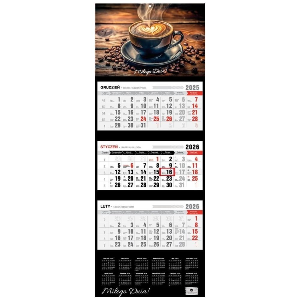 Kalendarz 2026 Trójdzielny PREMIUM Z WYPUKŁĄ GŁÓWKĄ. Format 315/810mm. Trzy komplety klasycznych kalendariów z przesuwnym okienkiem. Główka wypukła z otworem wierconym. Dodatkowo nazwy miesiąca i dni tygodnia w języku Ukraińskim, Angielskim i Niemieckim. Kalendarium dodatkowo zawiera fazy księżyca i znaki zodiaku. Dużo miejsca do notowania, czytelne duże litery i cyfry. DODATKOWO PRZEDŁUŻONE PLECKI KOLOREM DOPASOWANE DO WZORU ZE SKRÓCONYM KALENDARIUM NA ROK 2026. Nowoczesne i klasyczne wzornictwo, dopracowane wzory, czytelne kalendarium. Praktyczny i elegancki kalendarz który sprawdzi się zarówno w domu, biurze jak i innych pomieszczeniach.