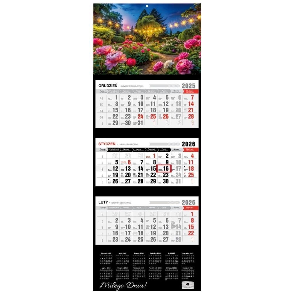 Kalendarz 2026 Trójdzielny PREMIUM Z WYPUKŁĄ GŁÓWKĄ. Format 315/810mm. Trzy komplety klasycznych kalendariów z przesuwnym okienkiem. Główka wypukła z otworem wierconym. Dodatkowo nazwy miesiąca i dni tygodnia w języku Ukraińskim, Angielskim i Niemieckim. Kalendarium dodatkowo zawiera fazy księżyca i znaki zodiaku. Dużo miejsca do notowania, czytelne duże litery i cyfry. DODATKOWO PRZEDŁUŻONE PLECKI KOLOREM DOPASOWANE DO WZORU ZE SKRÓCONYM KALENDARIUM NA ROK 2026. Nowoczesne i klasyczne wzornictwo, dopracowane wzory, czytelne kalendarium. Praktyczny i elegancki kalendarz który sprawdzi się zarówno w domu, biurze jak i innych pomieszczeniach.