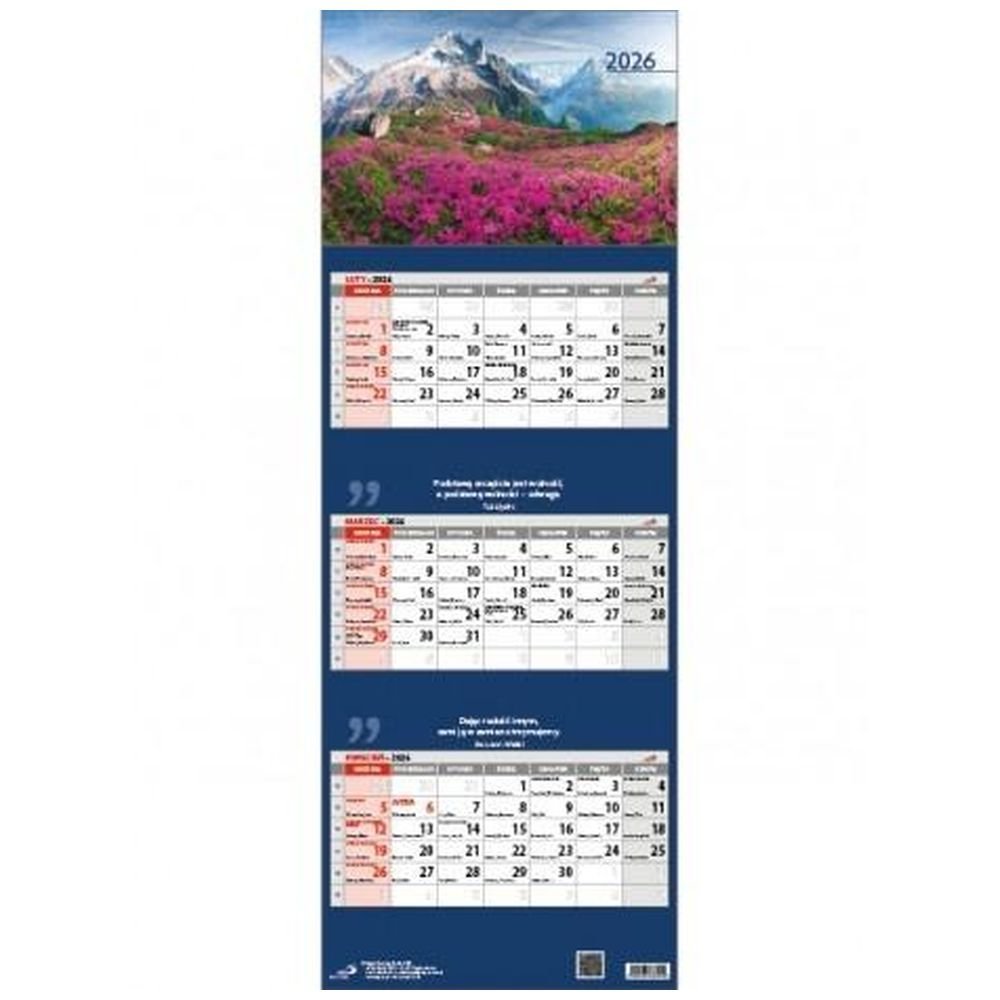 Atut tego kalendarza to czytelny, przejrzysty wygląd, dzięki któremu bez trudu odnajdziesz każdy ważny termin. Trójdzielny układ daje wgląd w trzy następujące po sobie miesiące bez konieczności przekładania stron, ułatwiając planowanie dni i tygodni. Kalendarz posiada pasek z okienkiem do zaznaczania bieżącej daty oraz otwór ułatwiający zamocowanie kalendarza.
