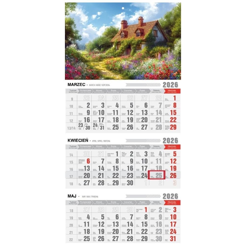 Kalendarz 2026 Trójdzielny Ekonomiczny JEDNOPLANSZOWY Z MAGNESEM oraz przesuwnym okienkiem. Format 300/623mm. Kalendaria w języku PL, EN, DE i UA. Główka z otworem wierconym oraz magnesem to doskonała propozycja do przyczepienia na lodówkę. Dodatkowo nazwy miesiąca i dni tygodnia w języku Ukraińskim, Angielskim i Niemieckim. Kalendarium dodatkowo zawiera fazy księżyca i znaki zodiaku. Dużo miejsca do notowania, czytelne duże litery i cyfry. 12 kart do zrywania.