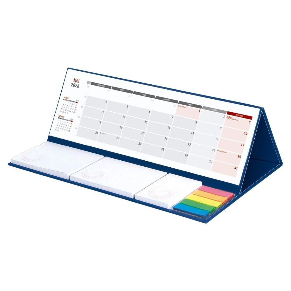 Wygodny kalendarz stojący na biurko z przejrzystym kalendarium w układzie trójdzielnym z poręcznymi karteczkami samoprzylepnymi do notowania. Przydatny zwłaszcza w biurze. W kalendarzu zaznaczono święta i daty imienin. Na tylnej części kalendarza istnieje możliwość wykonania nadruku reklamowego na obszarze o wymiarach 305 x 100 mm.