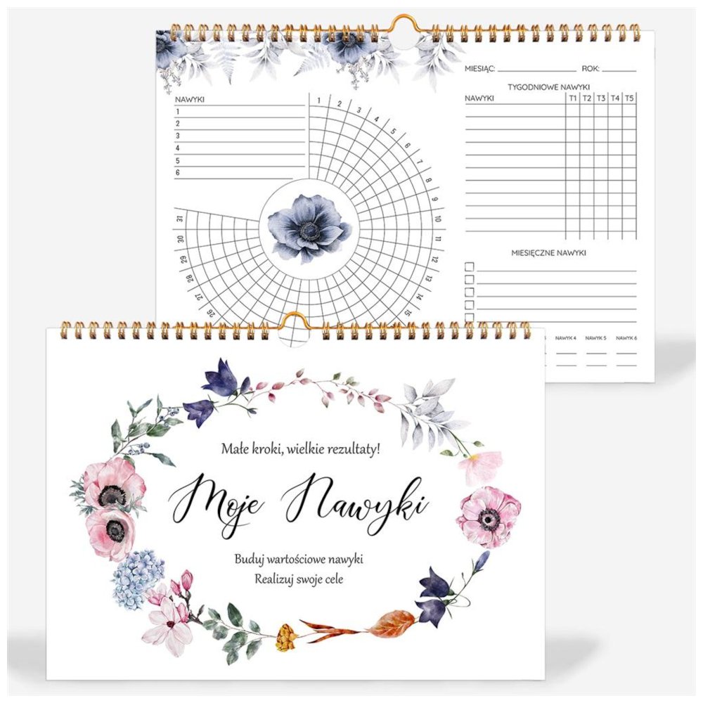 Moje Nawyki to kalendarz wspierający rozwój i kontrolę nawyków. Znany jest również pod angielską nazwą Habit Tracker. Ten planer pomoże Ci w monitorowaniu celów i nawyków w ujęciu dziennym, tygodniowym i miesięcznym Prowadząc kalendarz wizualizujesz swoją drogę do budowy wartościowych nawyków. Spoglądając na planer szybko ocenisz, które cele osiągasz łatwo, a nad czym musisz bardziej popracować. Odznaczanie swoich codziennych sukcesów motywuje do dalszego działania, a ich graficzna forma pozwala zobaczyć progres, jaki został przez Ciebie do tej pory osiągnięty. Układ stron każdego miesiąca pozwala na zapisywanie nawyków dziennych, tygodniowych i miesięcznych. Na dole strony można w łatwy sposób podsumować dni w których udało się zrealizować zaplanowane cele. Cechy szczególne: – Okładka i tylna strona wykonane z grubego papieru o gramaturze 350 g powleczone matową powłoką – 12 stron w kremowym papierze o gramaturze 190g – Minimalistyczny design z dominującym motywem kwiatowym – Spirala w kolorze ciemnozłotym umożliwiająca powieszenie kalendarza – Uniwersalny rozmiar – A4