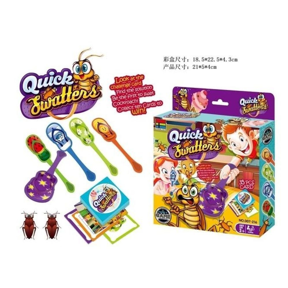 Quick Swatters – Dynamiczna gra zręcznościowa, która wciągnie Cię na długie godziny! Przygotuj się na pełną śmiechu i rywalizacji zabawę z Quick Swatters! Ta wciągająca gra zręcznościowa sprawdzi Twoją szybkość reakcji i koordynację wzrokowo-ruchową. Zasady są proste: wyłóż karty wyzwań, wypatruj odpowiedniego karalucha i bądź pierwszy, który go złapie przy pomocy kolorowej klapki pasującej do wzoru na karcie. W zestawie znajdziesz urocze, kolorowe klapki w kształcie klapek oraz karty z różnorodnymi wzorami karaluchów. Każdy gracz wybiera swoją klapkę i czeka na odkrycie karty wyzwania. Gdy tylko karta się pojawi, rozpoczyna się szaleńcza pogoń za odpowiednim karaluchem! Zbieraj karty za każde udane schwytanie. Quick Swatters to doskonały sposób na spędzenie czasu w gronie rodziny i przyjaciół. Gra dostarcza mnóstwo emocji, uczy refleksu i spostrzegawczości, a przy tym jest niezwykle zabawna. Kompaktowe opakowanie sprawia, że gra idealnie nadaje się na podróże i spotkania towarzyskie. Zawartość zestawu: Kolorowe klapki do łapania karaluchów. Karty wyzwań z różnymi wzorami karaluchów. Cechy produktu: Liczba graczy: 2-4 Rozwija refleks i koordynację wzrokowo-ruchową. Idealna na prezent i wspólne spędzanie czasu. Nie czekaj! Zostań mistrzem szybkich łapek z Quick Swatters!