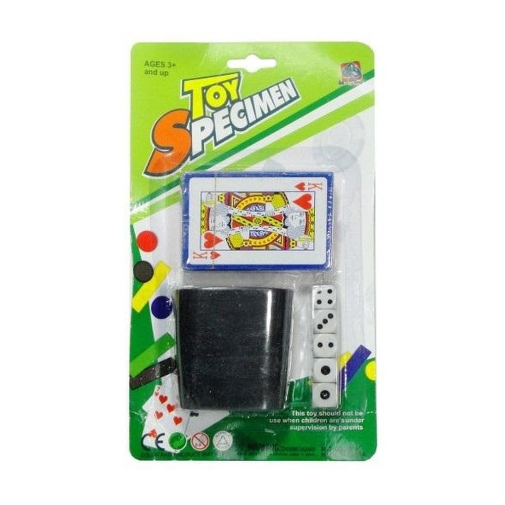 Zestaw do gry karty i kości. Produkt zapakowany w kartonową podstawkę z przezroczystym kloszem. Zestaw przeznaczony dla dzieci od 3 lat.
