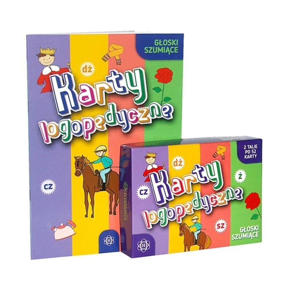 W zestawie znajdują się 2 talie kart logopedycznych, które zostały opracowane na takich samych zasadach jak tradycyjne karty. Funkcję kolorów spełniają tutaj głoski syczące: cz, dż, sz, ż. Zamiast figur karcianych występują ponumerowane obrazki, w których nazwach jest jedna z wymienionych głosek. Karty są oczywiście 52 po 13 dla każdej głoski.