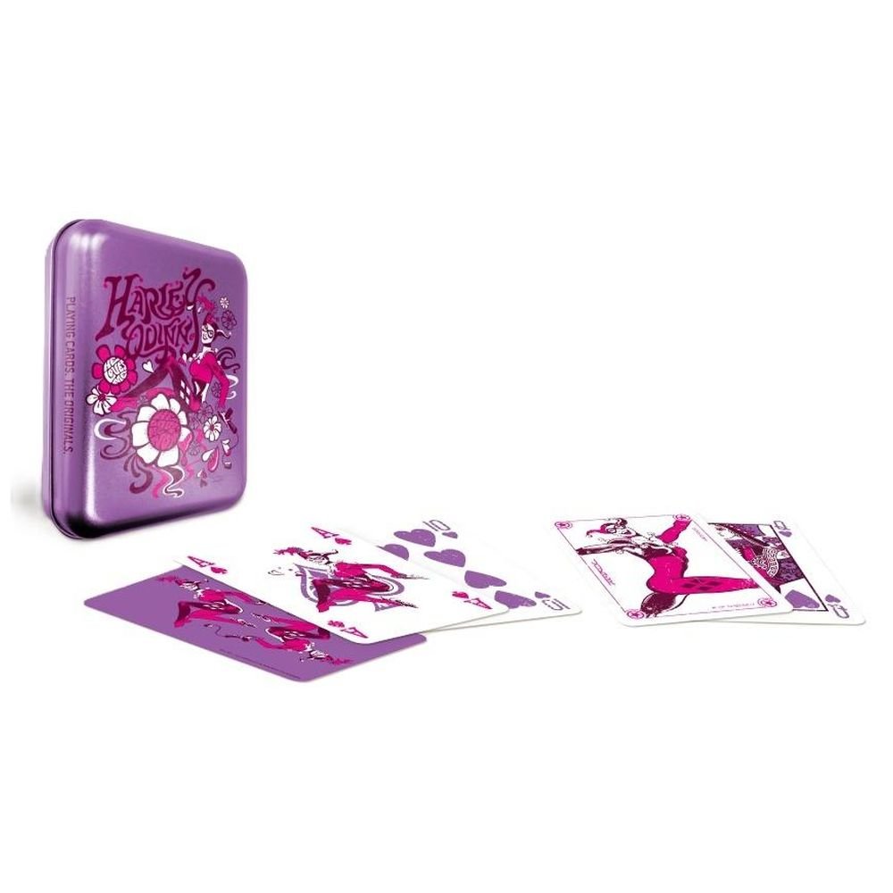 Stylizowana kultową postacią Harley Quinn talia kart do gry. 55 kart pakowanych w personalizowaną metalowa puszkę.