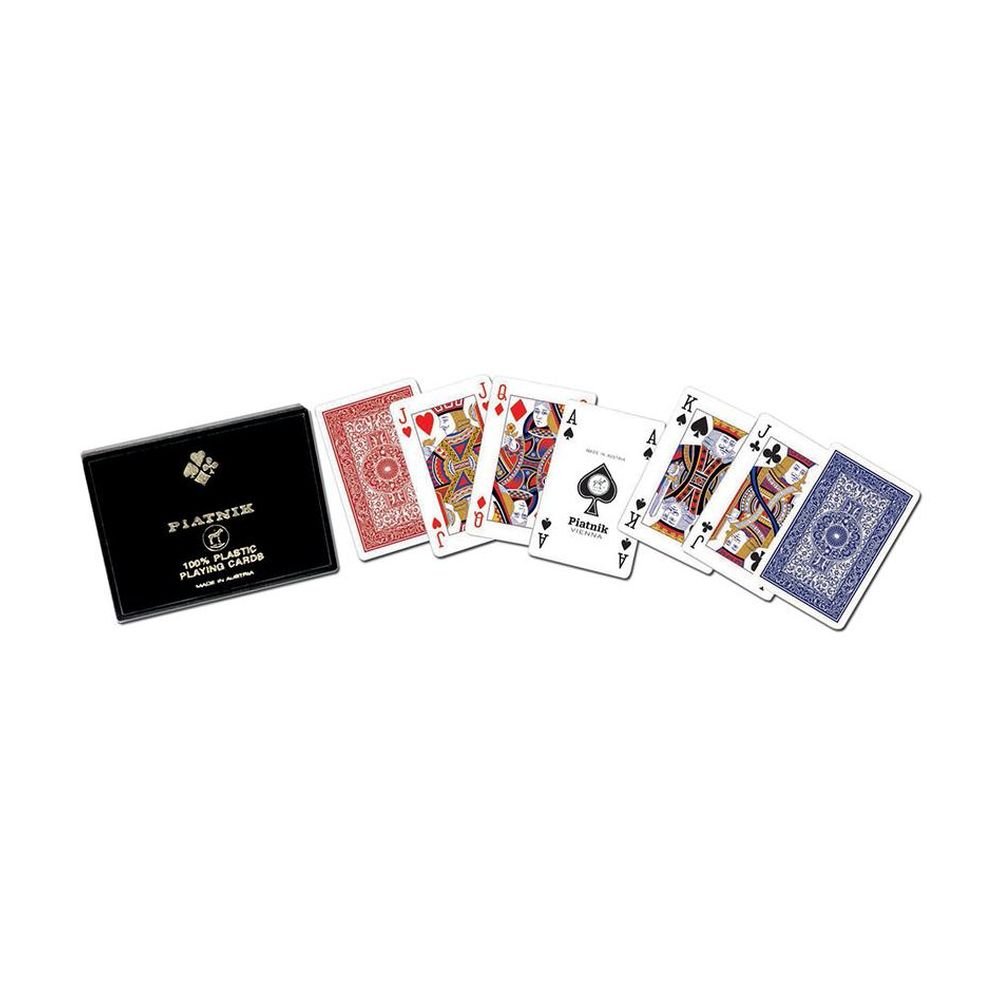 Najwyższej jakości w 100% plastikowe karty renomowanej firmy Ferd. Piatnik & Sohne. Czarne, tradycyjne pudełko zawiera 2 talie, składające się z 55 kart o wymiarach 58 x 89 mm. Idealne zarówno do brydża, pokera, remika jak i innych gier. Wyroby wiedeńskiej fabryki Ferd. Piatnik & Sohne od 1824 roku urzekają bogactwem wzorów i perfekcją wykonania. Jakość i tradycja!