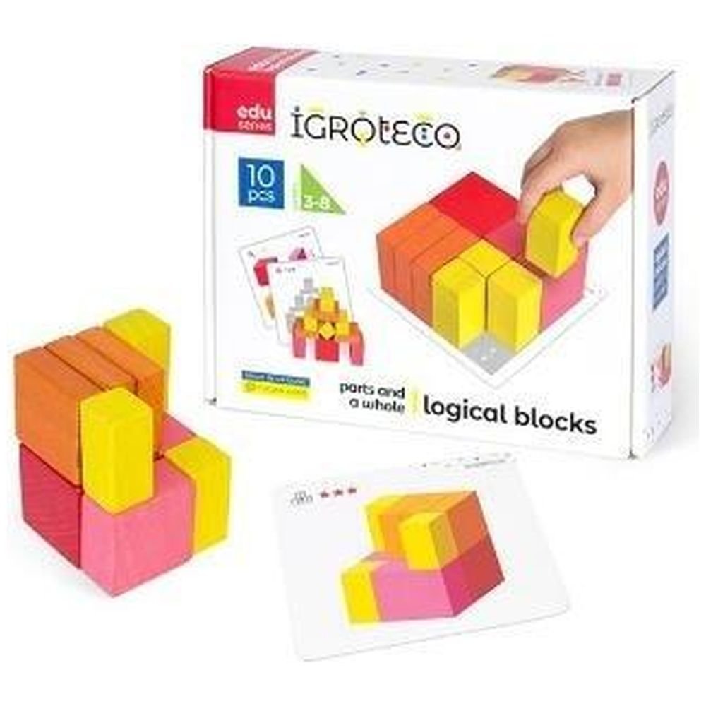 W zestawie: 10 kolorowych drewnianych klocków, 10 dwustronnych kart z zadaniami i wzorami, wym. opk: 21 x 17 x 6 cm.