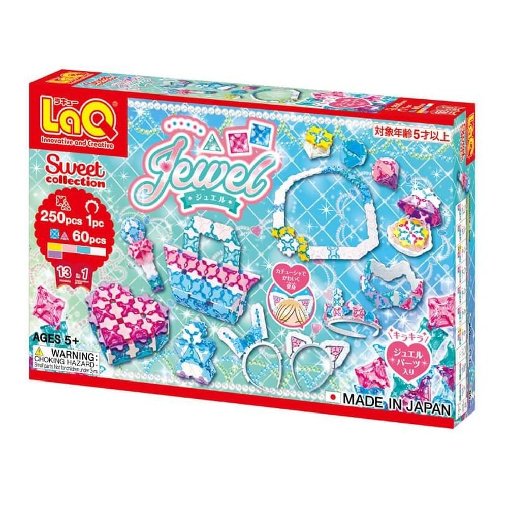 250 części; NOWOŚĆ! 60 nowych części LaQ "Jewel" (błyszczących diamentowych) Opaska LaQ "Headband Part" 13 schematów konstruowania: 5 kolorów; Zalecany wiek: 5+ Poziom trudności: Średni. Części LaQ są wielokrotnego użytku, a zestaw może być użyty do przebudowy nawet 13 różnych modeli. MADE IN JAPAN