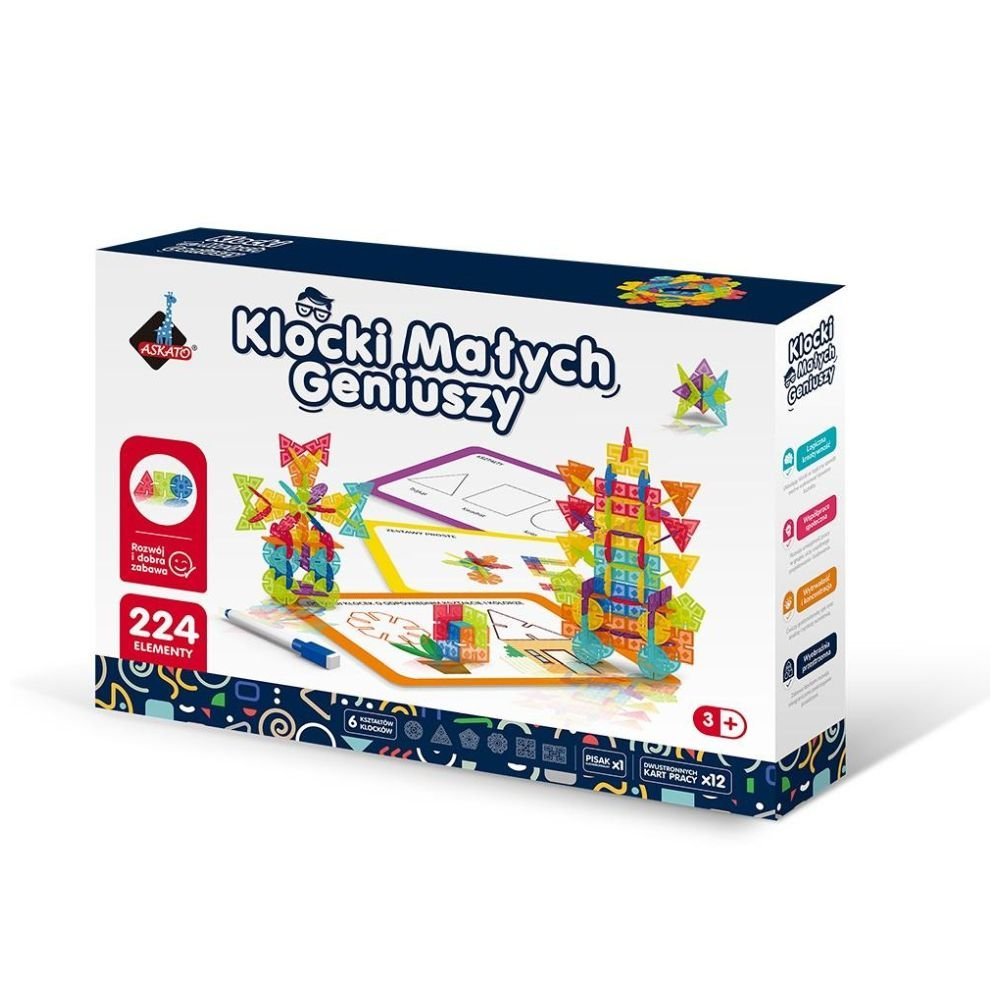 Odkryj świat kreatywnej zabawy i edukacji z zestawem Klocki Małych Geniuszy – Geometryczne Śnieżynki. Ten wielokolorowy zestaw zawiera 224 elementy, które pozwalają dziecku tworzyć różnorodne konstrukcje. Klocki wspierają rozwój spostrzegawczości, umiejętności liczenia i motoryki u dzieci. Każdy zestaw zawiera sześć różnych kształtów w siedmiu kolorach, które angażują dziecko do logicznego myślenia i rozwijania zdolności manualnych. W zestawie oprócz klocków znajdziesz również: książeczkę z przykładami konstrukcji do zbudowania przez dziecko. 12 kart z zadaniami. mazak suchościeralny. Ilość elementów: 224 Wymiary opakowania: 39 x 7 x 26.5 cm Wiek minimalny dziecka: 3 lata
