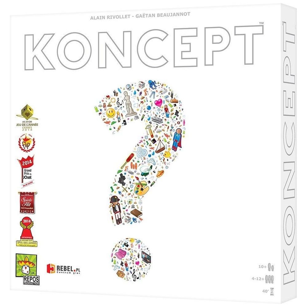 Zgadywanki w nietypowej odsłonie. “Położył główny znacznik na kategorii zwierzęta. Drugi na kropli wody… hmm… Zwierzę wodne? Ryba! Tak, ale to nie wszystko, pokazuje dalej… Drewno, nożyczki, ciąć, narzędzie… Ryba Piła!” W grze Koncept waszym celem jest odgadywanie haseł pokazywanych przez innych graczy. Ale… pokazujący nie może się odzywać ani nic pokazywać, czy rysować, do dyspozycji ma tylko planszę z różnymi obrazkami i za pomocą znaczników będzie wskazywał te, które będą miały was naprowadzić. “Mężczyzna, człowiek. Jego zawód, związany z walką… Coś więcej? Świat, białe, kółko, czerowne. Hmm, trudne… A, połączył kółko z czerwonym, patrz, przesunął znacznik na ikonie świata bardziej na flagę. Chodzi o flagę! Flagę kraju – biała z czerwonym kółkiem – Japonia! Pilot kamikadze czy samuraj? Przemijanie, czas, cofać się, wcześniej, czyli jednak samuraj!” Gracz ma do dyspozycji jeden główny znacznik, którym wyznacza kategorię główną i używając znaczników pomocniczych dookreśla ją wskazując inne skojarzenia. Jeśli potrzebuje może użyć dodatkowych znaczników w innym kolorze, aby pokazywać inne rzeczy, które mogą naprowadzić na trafne skojarzenie. “Główna kategoria pokazuje nam kobietę, która jest sportowcem. W drugiej stara nam się pokazać, że jej dyscyplina należy do sportów zimowych. Potem są dwa narzędzia, których używa w tej dyscyplinie. Jedne związane z nogami, drugie z rękami. To od nóg związane jest z podróżowaniem, a zimą w sporcie najlepiej podróżuje się na nartach, ale nie wpadłbym na to, gdyby nie ta rzecz związana z rękami. Tam bowiem mamy walkę i śmierć, więc musi to być broń. Dopiero całość naprowadziła mnie na trop. Hasło to: Justyna Kowalczyk!” Koncept jest grą elastyczną i podatną na drobne zmiany i nowinki w zasadach. Zadowolenie graczy jest wartością nadrzędną! W grze mogą się sprawdzić nawet najbardziej szalone pomysły, o ile wszyscy gracze je zrozumieją. “Zaznaczył walkę i położył dużo kosteczek na polu mężczyzny. Wojna!”. “Spirala, zwierzę, ok, ale znacznik położony pomiędzy kobietą, a mężczyzną?… A, no przecież! Ślimak, bo jest obojnakiem!” Koncept sprawdzi się w każdym towarzystwie, hasła mają 3 poziomy trudności, więc na najłatwiejszym można grać z dziećmi już od 10 roku życia. Do tego na każdej karcie jest 9 haseł, po 3 z każdego poziomu trudności, więc zawsze mamy wybór, a są one tak ułożone, aby każdy znalazł coś dla siebie. Zwycięża gracz, lub jeśli gramy drużynowo – gracze, którzy dzięki odgadnięciu największej ilości haseł zgromadzili najwięcej punktów. Lubisz gry towarzyskie, w których zgaduje się hasła przez pokazywanie, rysowanie i opowiadanie? Koncept to nowy pomysł, którego jeszcze nie było. Zaproś swoich znajomych do tej gry i po raz kolejny bawcie się świetnie wytężając umysł i odnajdując właściwe skojarzenia. Nie zwlekaj, teraz czas na Twój koncept! Liczba graczy: 4 – 12 osób, Czas gry: ok. 30 – 40 minut, Waga: ok. 1.00 kg. Zawartość pudełka: 1 plansza z symbolami, 5 zestawów pionków, 1 zielony zestaw składający się z pionka Głównej Kategorii (duży znak zapytania) i 10 kosteczek, 4 zestawy (niebieski, czarny, czerwony, żółty), z których każdy składa się z pionka Podkategorii (wykrzyknik) i 8 kosteczek, 110 kart z hasłami; na każdej 9 słów/fraz o trzech poziomach trudności: łatwym, trudnym i mistrzowskim, żetony pojedynczych i podwójnych punktów zwycięstwa (podwójne są warte 2 PZ, pojedyncze 1 PZ), 2 pomoce gracza, 1 miseczka.
