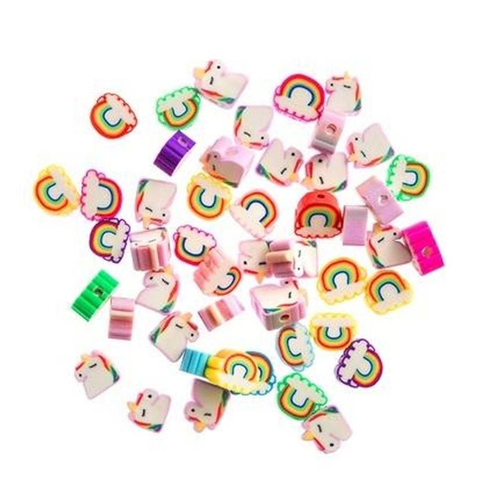 Koraliki polimerowe z motywami jednorożców i tęczy to urocze, kolorowe elementy biżuterii, które doskonale nadają się do tworzenia wyjątkowych ozdób. Wykonane z wysokiej jakości polimeru, trwałe, lekkie i wygodne w noszeniu. Zestaw zawiera 48 sztuk koralików o wielkości 1 cm.