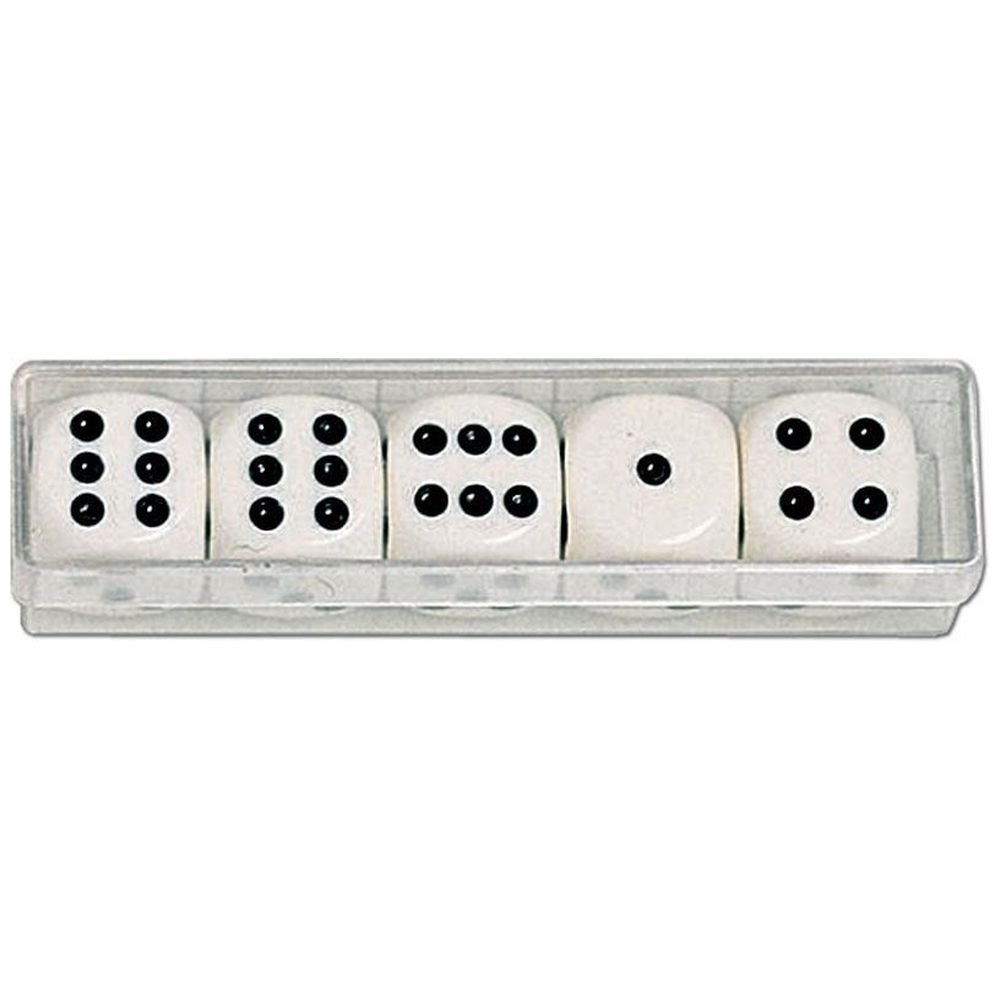 Zestaw 5 dużych kości (22 mm) w przezroczystym etui. Dołączona instrukcja do gry w kości oczkowe w języku polskim.