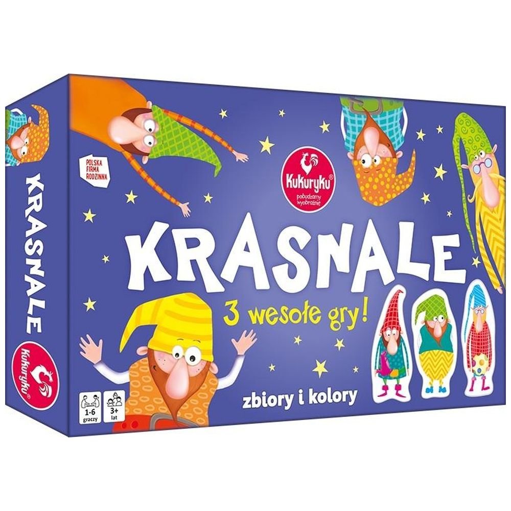 Krasnale to zestaw wesołych gier dla całej rodziny. Trzech braci zachęca do zabawy i nauki. Gry uczą rozróżniania wzorów, kolorów, kształtów, ich analizowania i porównywania, ćwiczą spostrzegawczość i refleks. W instrukcji znajduje się propozycja trzech gier, wystarczy jednak trochę fantazji, aby wymyślić własne zasady z udziałem krasnali.