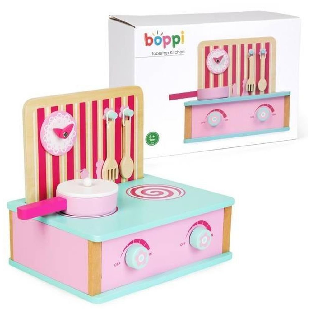 Drewniany zestaw od BOPPI to mnóstwo kreatywnej zabawy, odtwarzanie ról, gotowanie, zabawa w dom. Poręczna i wygodna drewniana kuchnia od BOPPI to duża, stołowa, słodka kuchenka z akcesoriami do gotowania. W kuchni znajdują się płyta kuchenna z pokrętłami i zegarem, składana tablica z menu, drewniany widelec i łyżka oraz rondel/patelnia. Kuchenka i akcesoria wykonane są z drewna z dbałością o detale.