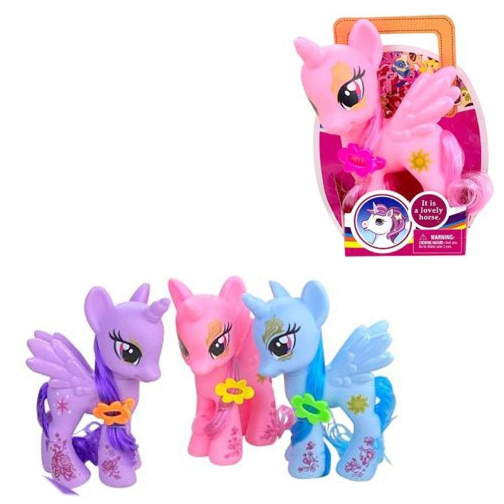 Kucyk Bajkowy jednorożec z brokatowymi skrzydłami występuje w 3 kolorach: fioletowym, różowym i niebieskim W zestawie znajduje się kucyk i spineczka Wymiary opakowania: 11.