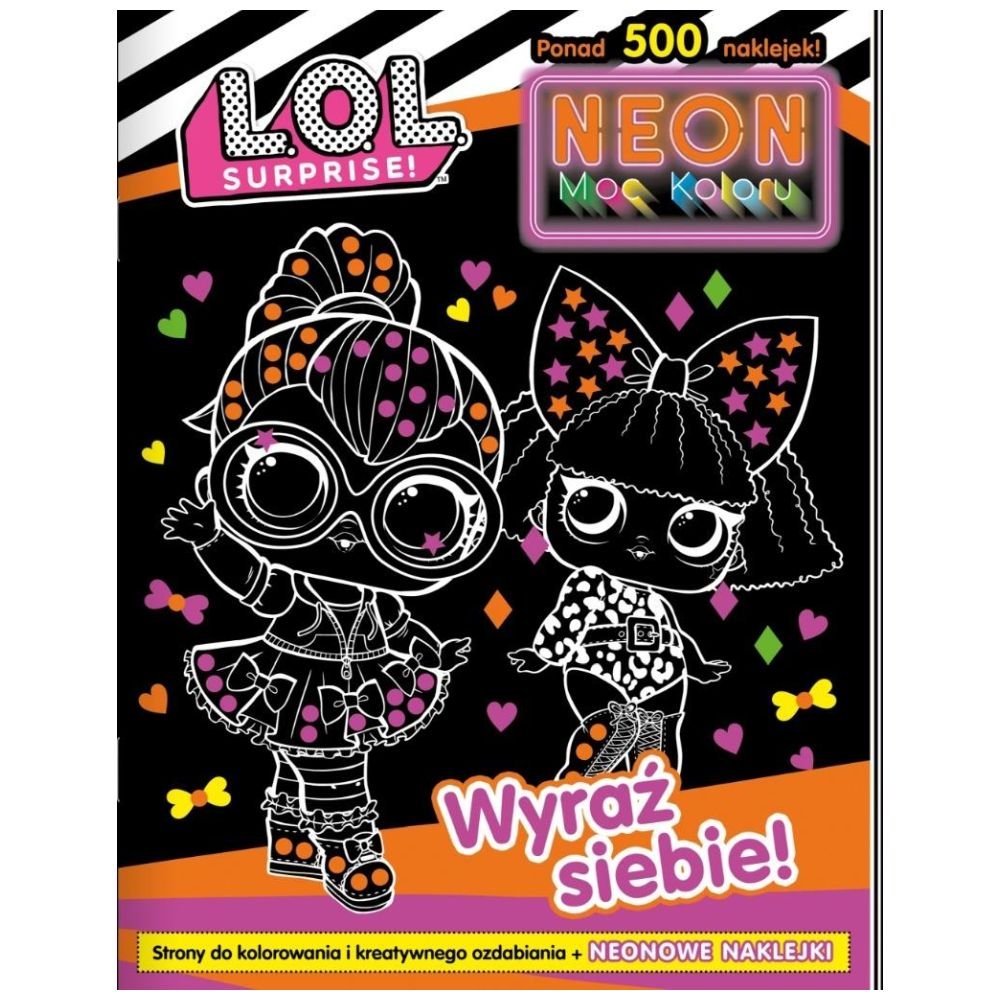 L.O.L. Surprise! Neon Moc Koloru to książka z obrazkami oraz ponad 500 neonowymi naklejkami. W środku strony z obrazkami do kolorowania oraz kreatywnego ozdabiania, dzięki czemu fanka uroczych laleczek może tworzyć wyjątkowe prace. Każda strona to nowa przygoda z uroczymi L.O.L. Surprise!, a kolorowanie ulubionych bohaterów i wyklejanie stron neonowymi naklejkami to świetna zabawa. Efekt końcowy może zaskoczyć!