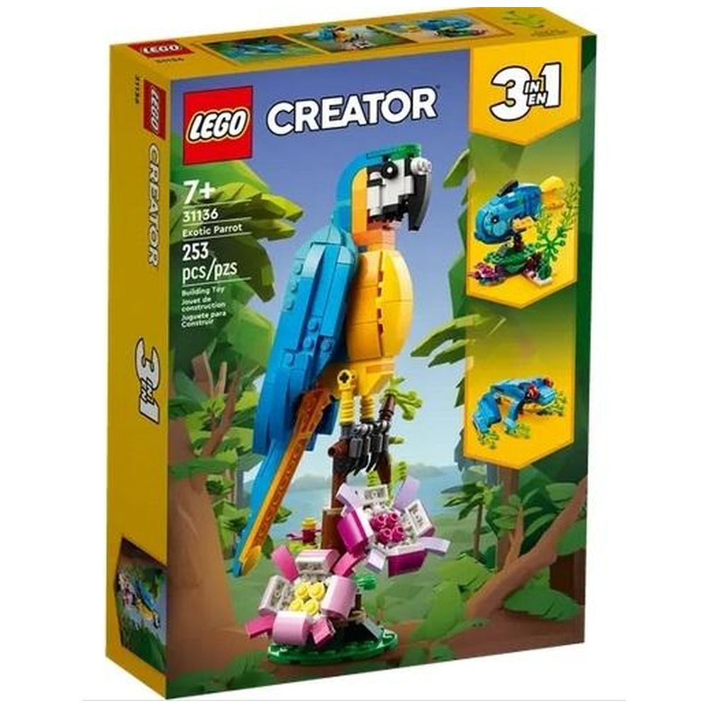 Dzięki zestawowi LEGO(R) Creator 3 w 1 Egzotyczna papuga (31136) mali budowniczowie i wielbiciele zwierząt w wieku od siedmiu lat wybiorą się w emocjonującą podróż do lasu deszczowego. Zawiera on kolorową papugę, która może obracać ciało, siedząc na gałęzi, a także poruszać skrzydłami i ogonem.