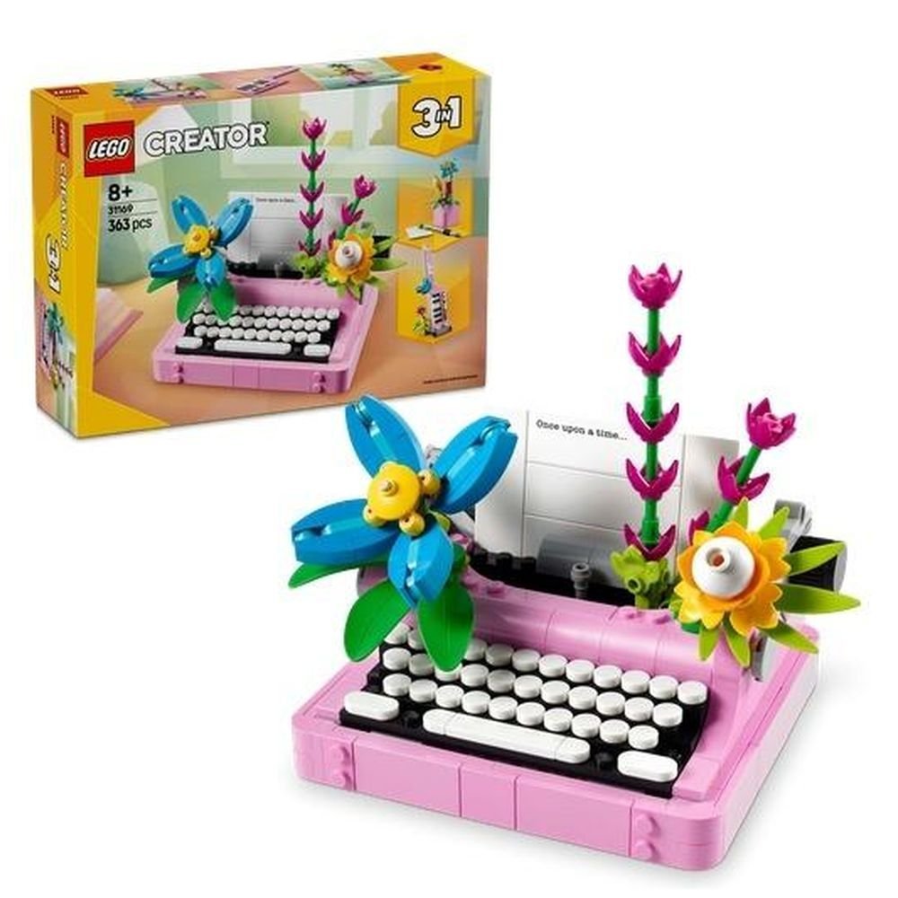 Podaruj ośmioletnim i starszym fanom kwiatów, sztuki i designu ten zestaw LEGO(R) Creator 3 w 1 Maszyna do pisania z kwiatami (31169). Ta miniaturowa maszyna do pisania jest ozdobiona czterema kolorowymi kwiatami z klocków, obejmuje ruchomą klawiaturę i wałek oraz arkusz papieru zbudowany z klocków.