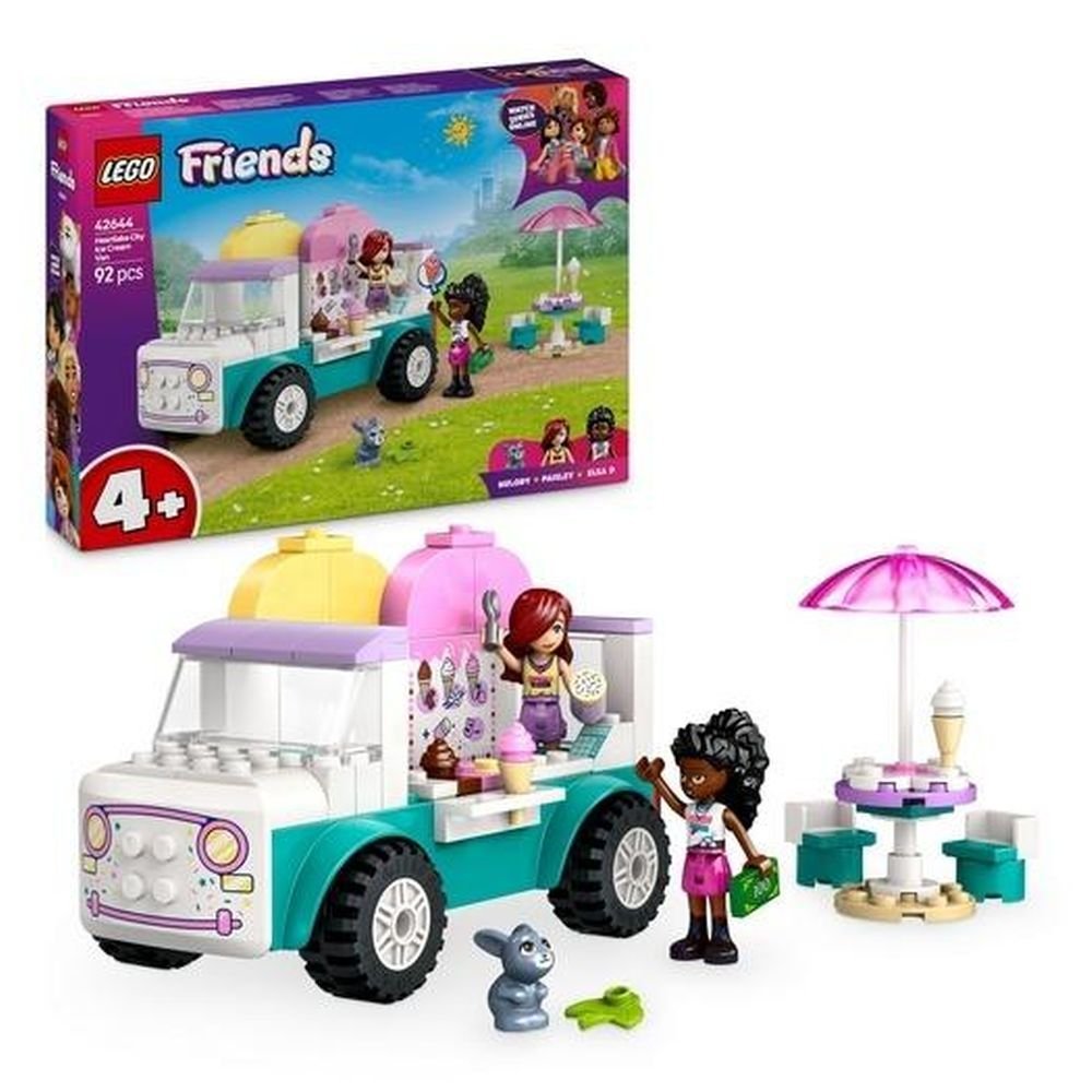 Ten zestaw to słodka gratka dla dzieci w wieku od czterech lat, które lubią odgrywać fajne interakcje z klientami. LEGO(R) Friends Furgonetka z lodami w mieście Heartlake (42644) zawiera furgonetkę z lodami do zbudowania, dwie minilaleczki, figurkę króliczka oraz akcesoria spożywcze.