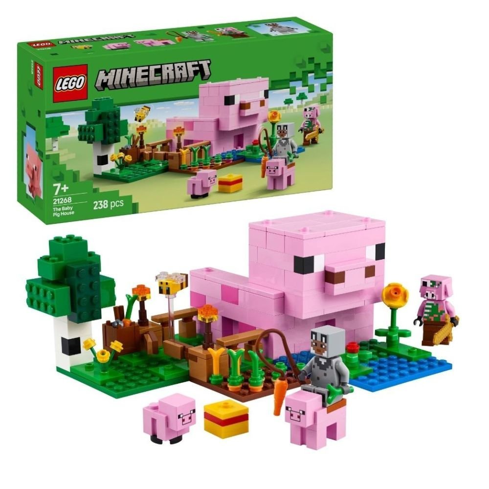 Ta kreatywna zabawka do zbudowania jest osadzona w leśnym biomie z gry Minecraft i zawiera wiele figurek z popularnej gry wideo: bohatera w wilczej skórce, świniątko i piglina zombie. Tak jak w grze dzieci mogą osiodłać dorosłą świnię i zawiesić przed nią marchewkę, aby przejechać się po domu i ogrodzie w kształcie prosiaczka. Jest tu także małe pole z ziemniakami i burakami do uprawy oraz pole z bramą, przez którą można przeprowadzić świniątko. Dzieci mogą uciec przed piglinem zombie, wchodząc do domu, gdzie znajduje się łóżko, regał na książki i stół rzemieślniczy inspirujący do twórczej zabawy. Dodatkową zabawę zapewnia aplikacja LEGO(R) Builder, w której dzieci mogą powiększać i obracać modele w 3D na swoim urządzeniu.
