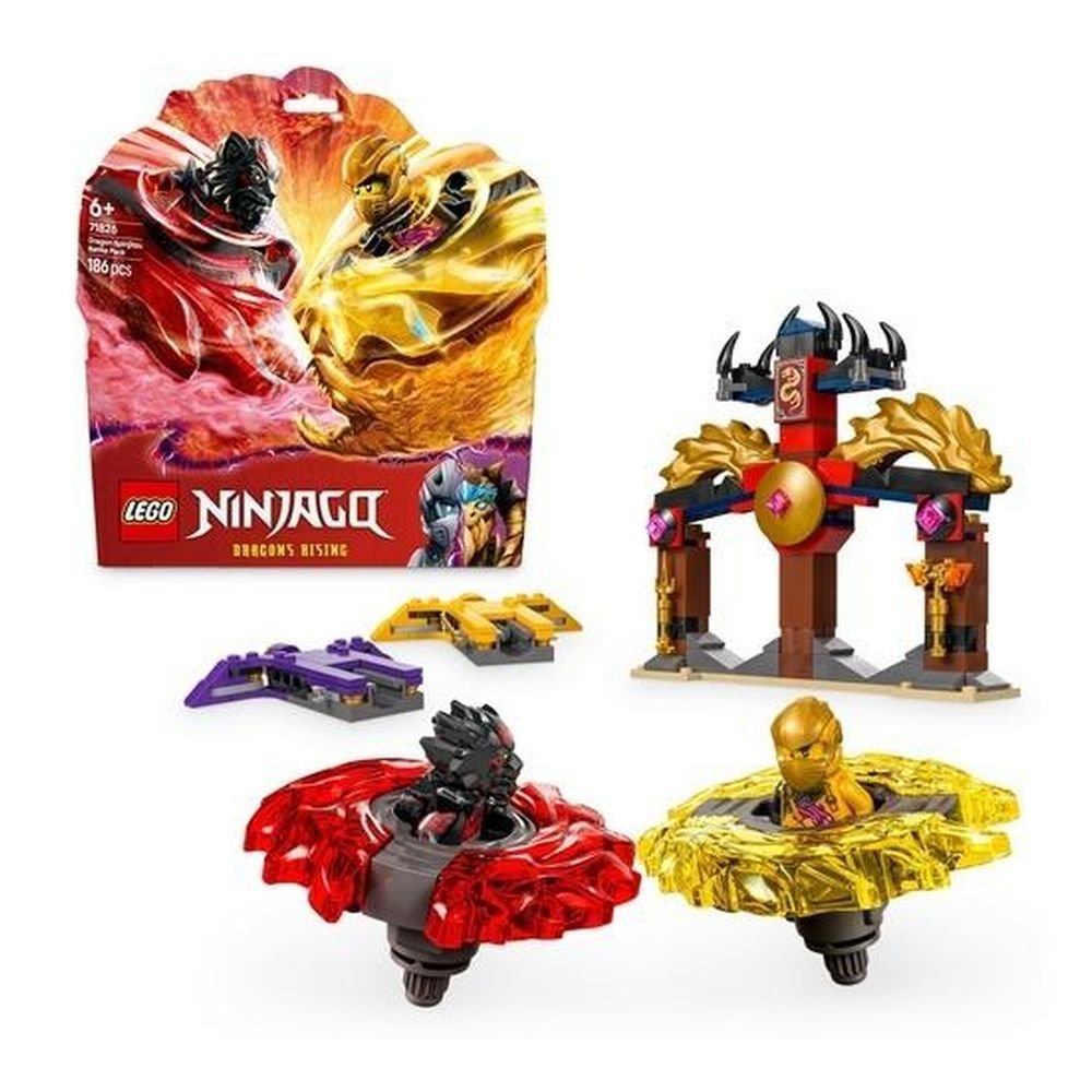 Zestaw Smocze Spinjitzu zestaw bitewny (71826) umożliwia sześciolatkom i starszym dzieciom odgrywanie niesamowitych akcji z trzeciego sezonu serialu NINJAGO(R) Powstanie Smoków. Ten mały zestaw LEGO(R) zawiera świątynię areny, dwie minifigurki Arina i Rasa oraz dwa smocze spinnery Spinjitzu, które dzieci mogą umieścić w wyrzutniach i wystrzelić je, by ze sobą walczyły.