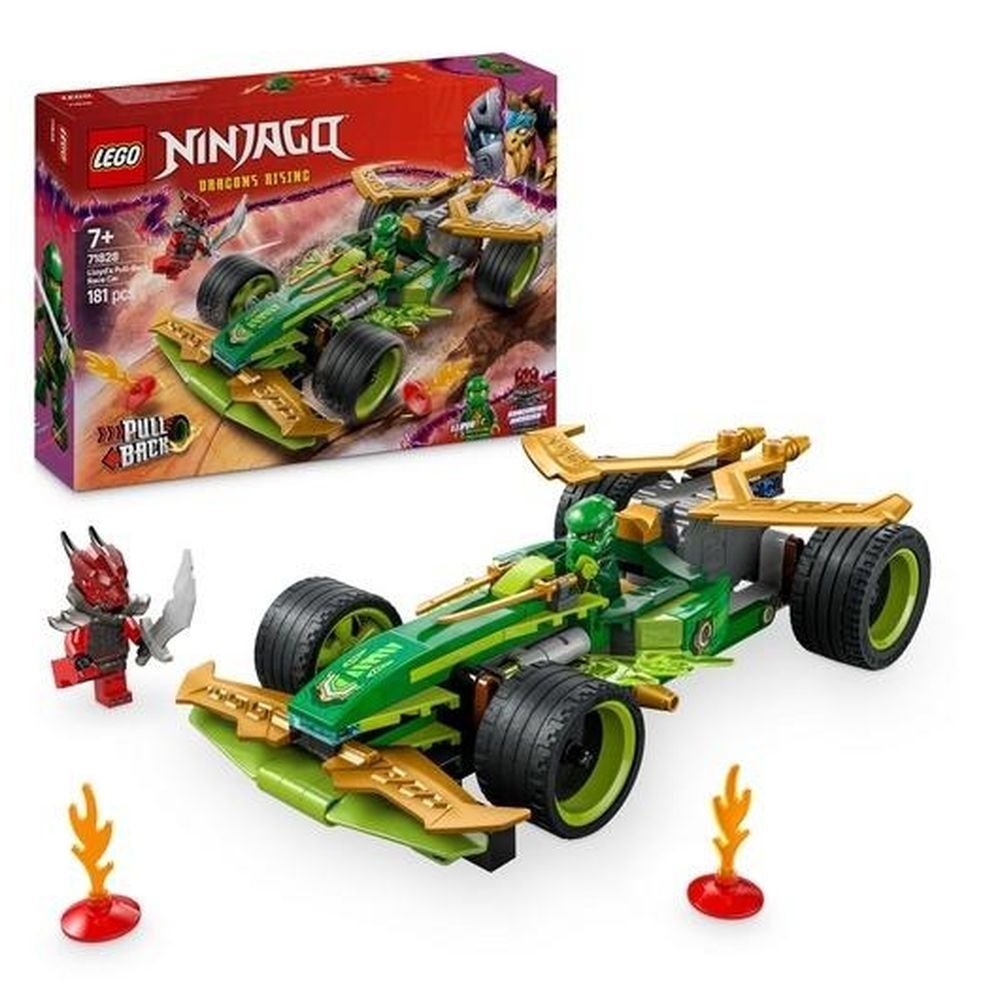 Zaskocz małego ninja w wieku od siedmiu lat i wręcz mu pierwszy w historii samochód wyścigowy NINJAGO(R) z napędem typu pull-back! Dzięki zestawowi Samochód wyścigowy Lloyda z napędem typu pull-back (71828) dzieci mogą odtworzyć sceny z trzeciego sezonu serialu NINJAGO(R): Powstanie Smoków. Wystarczy, że pociągną i puszczą pojazd, aby pędził jak błyskawica. Fajny samochód wyścigowy ma cztery opony, kokpit na minifigurkę i jest ozdobiony zielonymi ostrzami w kształcie piorunów.