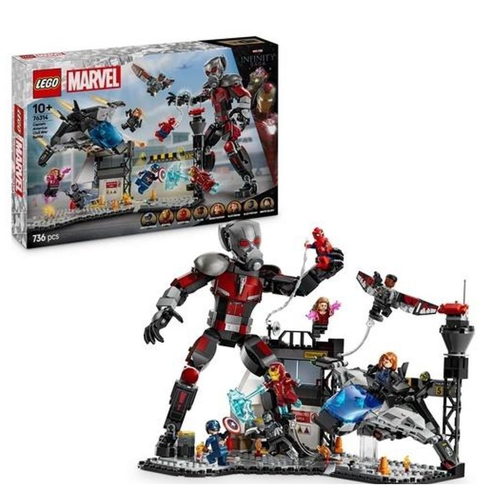 Ten zestaw jest oparty na scenie bitwy na lotnisku z filmu Kapitan Ameryka: Wojna bohaterów Marvel Studios. Zawiera osiem figurek Kapitana Amerykę, Zimowego Żołnierza, Wandę, Falcona, Iron Mana, Spider-Mana, Czarną Wdowę i Czarną Panterę z bronią i akcesoriami, a także w pełni ruchomego Ant-Mana o wysokości 24 cm. Samolot Quinjet ma składane skrzydła i otwierany kokpit, w którym mieści się minifigurka pilota. Akcję urozmaica dodatkowo funkcja wybuchającej beczki wbudowana w scenerię lotniska. Dzieci mogą przybliżać i obracać model podczas budowania za pomocą cyfrowej aplikacji LEGO Builder.