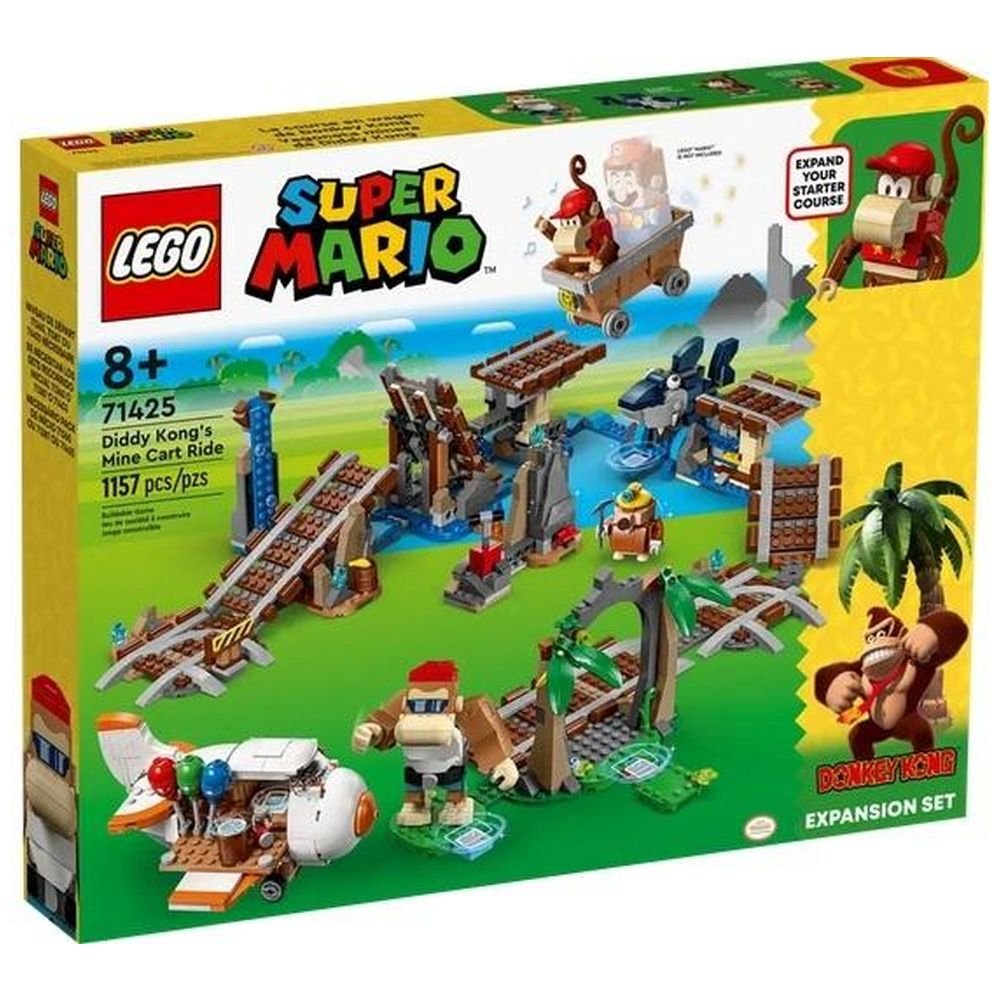 Stwórz legendarny poziom Donkey Konga w zbudowanym z klocków świecie LEGO(R) Super Mario dzięki zestawowi Przejażdżka wagonikiem Diddy Konga – zestaw rozszerzający (71425). Umieść figurkę LEGO(R) Mario, LEGO(R) Luigi lub LEGO(R) Peach (brak w zestawie) w wagoniku kopalnianym i przejedź się po torze. Zepchnij Snagglesa z drogi, napraw zepsuty odcinek toru, pokonaj Mole Minera i "wysadź" skałę, aby odsłonić kiść bananów. Możesz je zjeść lub podarować Funky Kongowi lub Diddy Kongowi. Kup balony w sklepie lotniczym i "lataj" samolotem, aby zarobić jeszcze więcej cyfrowych monet. Uwaga: do interaktywnej gry wymagany jest zestaw startowy 71360, 71387 lub 71403.