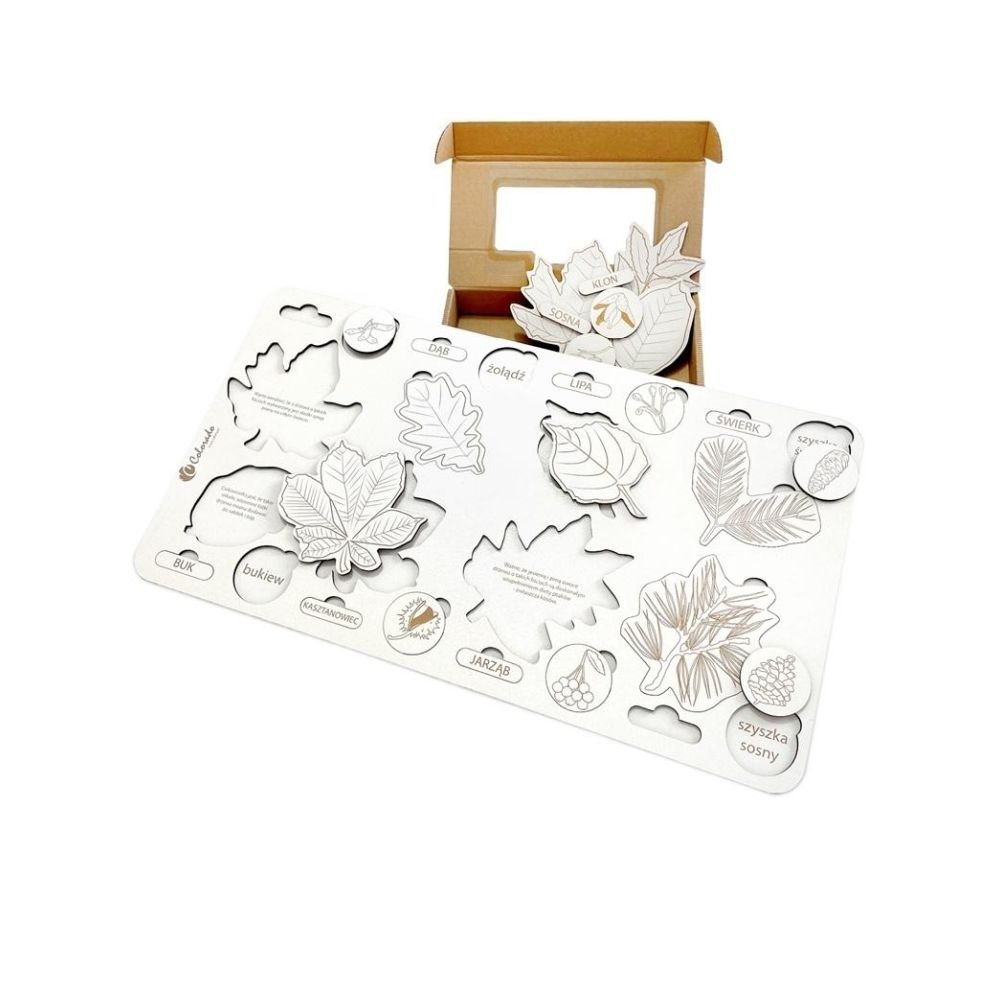 - 8 puzzli liści z wygrawerowanym ich wyglądem,