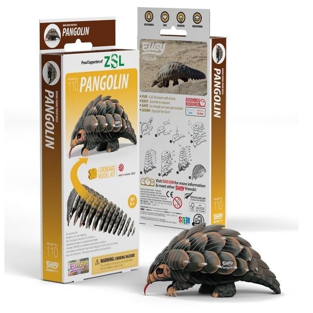 Eugy zaprojektowane w Nowej Zelandii są wykonane z przyjaznego dla środowiska kartonu pochodzącego z recyklingu i farby na bazie ryżu. Zestaw zawiera 30 ponumerowanych elementów układanki, oczy, nietoksyczny klej oraz instrukcję do zbudowania niesamowitego ssaka, łuskowca.