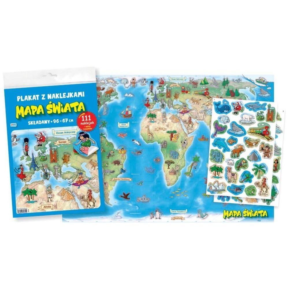 Świat jest piękny i bardzo różnorodny. Na każdym kontynencie i we wszystkich morzach i oceanach można znaleźć coś niesamowitego. Krzyczący strażnik królewski, pociąg jadący do celu niemal tydzień, plujące lamy czy widoczna z kosmosu rafa koralowa – czy nie jest to fascynujące? Dzieci są ciekawe tego, co dzieje się wokół nich, a podróże są świetną okazją, by pokazywać im świat i uczyć otwartości, tolerancji i wrażliwości. Drogi Rodzicu, nie zawsze masz możliwość w danym momencie spakować walizkę i wyruszyć wraz z dzieckiem w podróż, ale możesz poświęcić swój czas, by zacząć pokazywać mu odległe zakątki świata, chociażby w albumach, na zdjęciach i w filmach. Przygotowana przez nas mapa będzie doskonałym wsparciem i przewodnikiem. Zamieściliśmy na niej najbardziej charakterystyczne dla danego miejsca zwierzęta, budowle czy postacie. Niech staną się dla Ciebie inspiracją. Drogie Dzieci, specjalnie dla Was przygotowaliśmy zestaw naklejek, które umieszczone we właściwym miejscu pomogą zapamiętać to, co niezwykłego występuje na konkretnym kontynencie lub w wodach go otaczających. Bawcie się w rodzinne podróżowanie palcem po mapie, zachęcajcie siebie nawzajem do poznawania tego, co nieznane i do wspólnego spędzania czasu. A może będzie to początek wielkiej podróżniczej przygody w rzeczywistości? Publikacja składa się z trzech części: kolorowej mapy o wymiarach 96 x 67 centymetrów, 111 naklejek oraz tyluż opisów do przedstawionych na nich rysunków. Krótkie teksty zawierają wyjaśnienia pojęć, ciekawostki oraz lokalizacje.