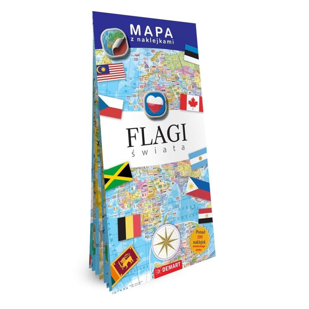 Składana mapa świata w formacie B1 z dołączonymi naklejkami wielokrotnego użytku, do samodzielnego uzupełnienia treści mapy. Mapa zawiera opisy państw, stolic, większych wysp i wód. Zabawa polega na przyklejeniu na mapie właściwej dla danego państwa flagi. Sprzyja zapamiętywaniu flag i położenia różnych państw. Na mapie umieszczono także zegary pokazujące godzinę w różnych strefach czasowych. Na odwrocie mapy znajdują się flagi z podstawowymi informacjami o każdym z państw.