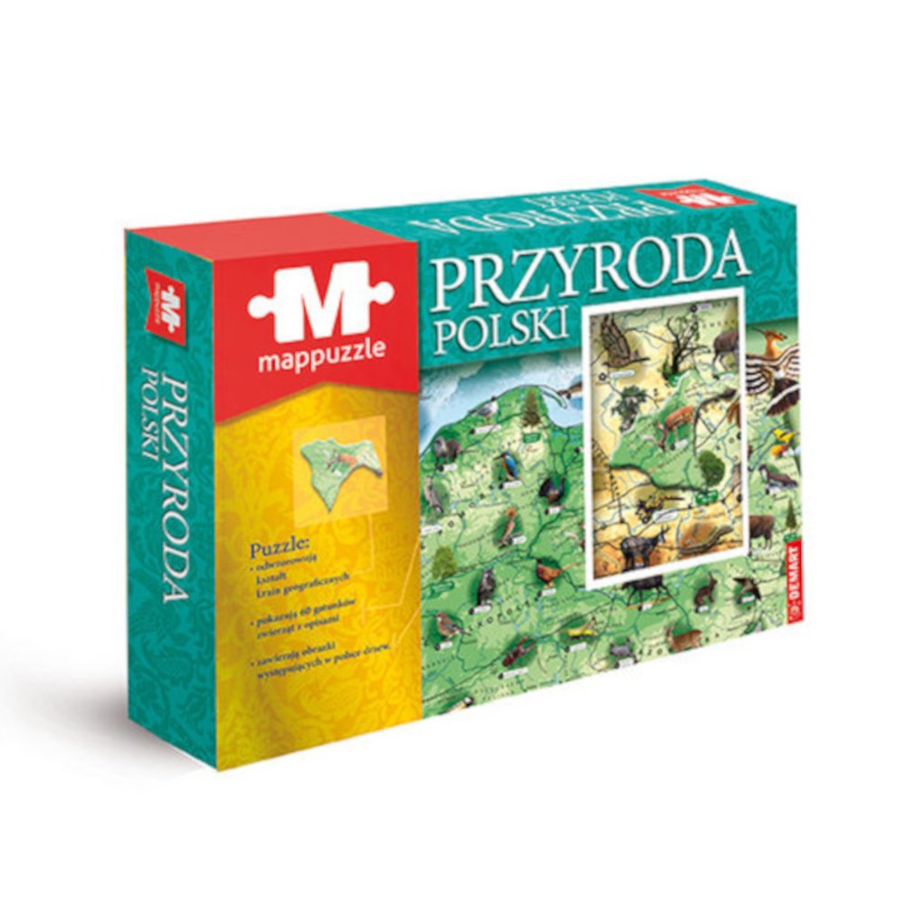 Elementy puzzli odwzorowują kształt krain geograficznych oraz zwierząt i pomnikowych drzew Polski.