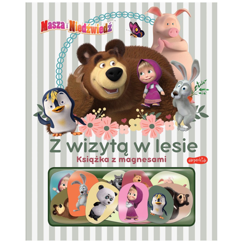 Wpadnij z wizytą do świata, w którym mieszkają bohaterowie twojej ulubionej kreskówki! Na każdej stronie tej książki czekają znane z serialu Masza i Niedźwiedź miejsca. Przytulny i pełen bibelotów dom misia, uroczy pokój Maszy, polana zamieszkała przez wiecznie głodne Wilki i zielony las zapraszają do zabawy! Do książki dołączono dziesięć magnesów z postaciami. Są wśród nich nie tylko Masza i Niedźwiedź, ale także leśne zwierzaki i czworonożni przyjaciele zamieszkujący podwórko Maszy. Magnesy z postaciami można umieścić na dowolnej stronie i w dowolnej scenerii, tworząc całkiem nowe ilustracje do bajki. Komponując scenki z użyciem magnesów, dziecko rozwija kreatywność, zmysł obserwacji, a przy okazji także zdolności manualne. Każda nowa scenka to temat do intrygującej rozmowy z kilkulatkiem, a magnesy można przyczepiać także w innych miejscach – na lodówce czy tablicy magnetycznej. Książka ma w środku bezpieczne zaokrąglone rogi, a porządny karton wysokiej jakości wytrzyma wiele dziecięcych eksperymentów.