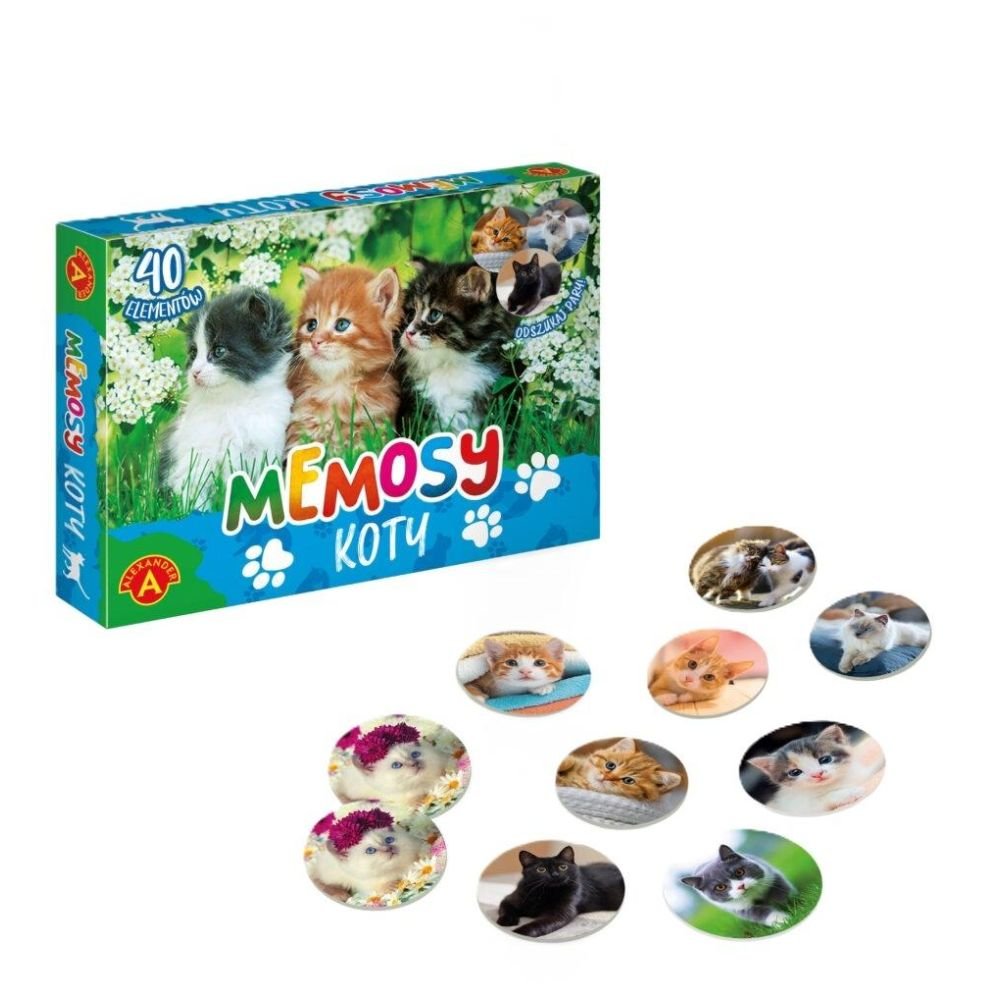 Memosy Koty to gra w której wygrywa ten, kto najlepiej zapamięta położenie par tych samych obrazków. Tabliczki rozkładamy na stole rewersem do góry, a potem odkrywamy na chwilę jedna po drugiej i próbujemy z pamięci wskazać miejsce pasującego obrazka. Gra jest skierowana jednocześnie do dzieci i dorosłych. To świetny trening pamięci i spostrzegawczości. Zapewnia dużo dobrej zabawy i emocji w otoczeniu przepięknych zdjęć kotów.
