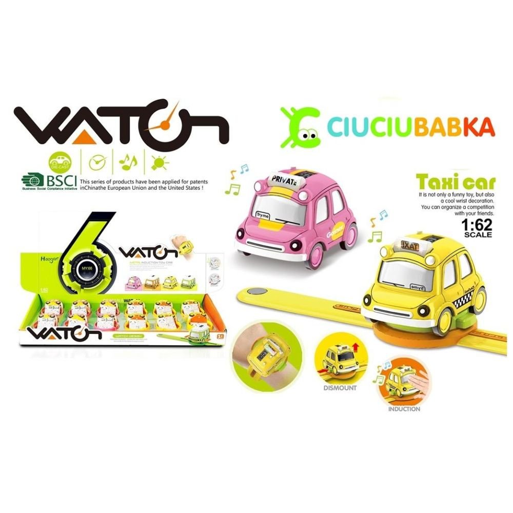 zegarek z odpinanym samochodzikiem , który gra, świeci, dodatkowo po naciśnięciu przedniej szyby uruchamia się sensor, który zmienia funkcje świetlno – dźwiękowe