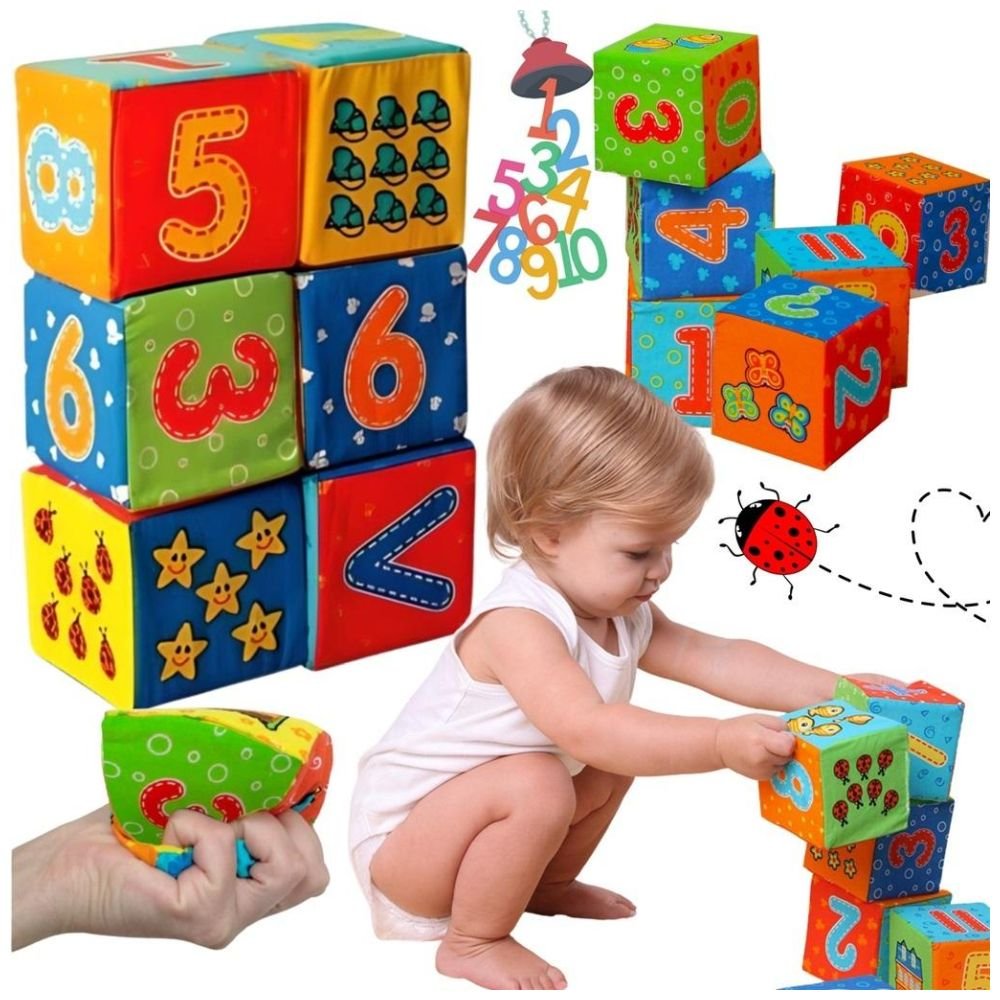 Miękkie kostki z jasnymi, tematycznymi rysunkami wprowadzają dziecko w otaczający go świat.