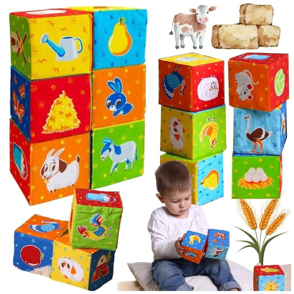 Miękkie kostki z jasnymi, tematycznymi rysunkami wprowadzają dziecko w otaczający go świat.