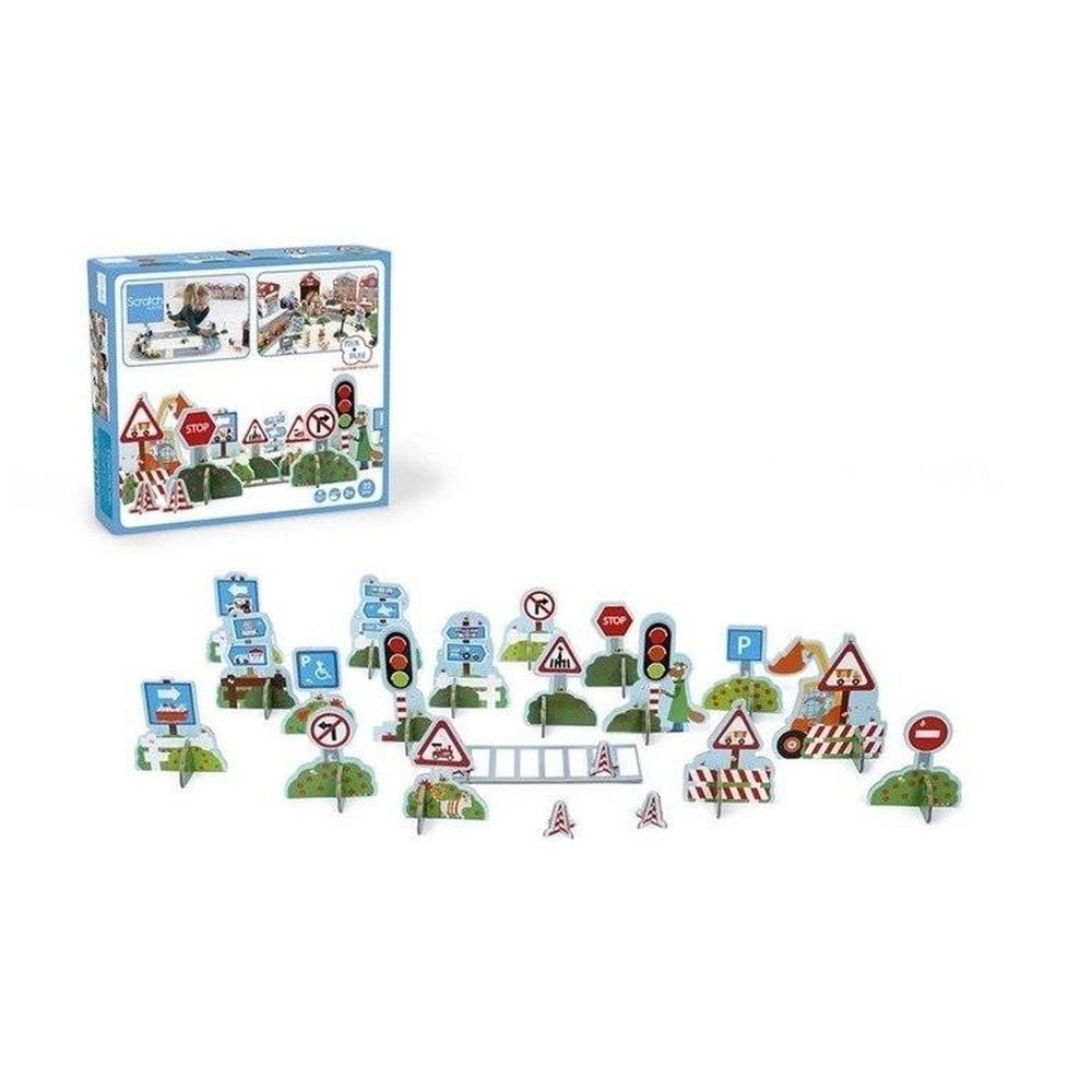 Mix&Play – Znaki drogowe to zestaw do samodzielnego budowania makiety skrzyżowania ze znakami drogowymi na ulicy. Wspaniała zabawa dla każdego malucha, która uczy i rozwija zdolności motoryczne u dziecka, ćwiczy pamięć, koncentrację i logiczne myślenie. Poszczególne elementy należy połączyć ze sobą na wcisk i powstaje skrzyżowanie z przejściem dla pieszych, znakami drogowymi i sygnalizacją świetlną. Układanka składa się z 22 elementów. Produkt wykonany z wysokiej jakości tektury, zapakowany w urocze pudełko z ilustracjami.