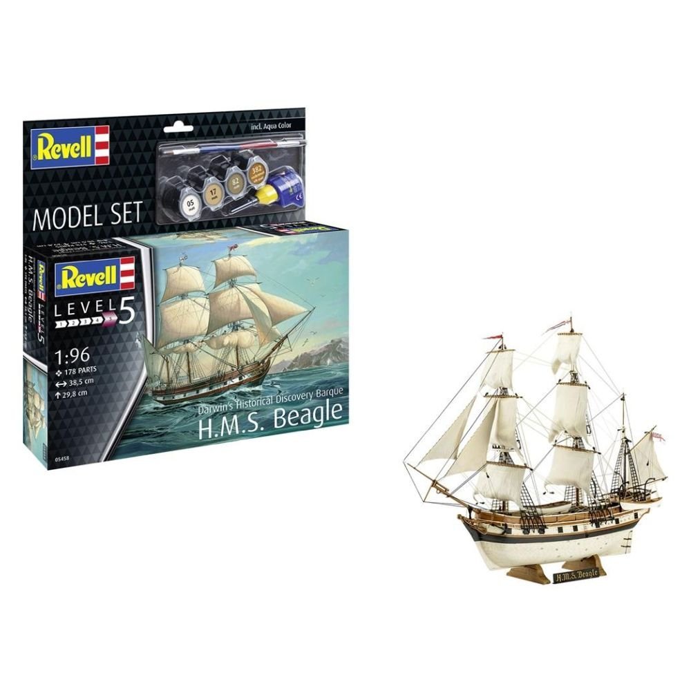 Zestaw modelarski z akcesoriami (4 podstawowe farbki, pędzelek, klej). H.M.S. Beagle – brytyjski okręt badawczy na którym Charles Darwin odbył swoją słynna podróż dookoła świata. Plastikowy model do sklejania REVELL (REV-65458). Specyfikacja Numer katalogowy:REV-65458 Producent: Revell Wymiary: 365x384x65 Długość: 385 mm Wysokość: 298 mm Skala: 1:96 Ilość elementów: 178 Instrukcja: tak Grupa wiekowa: 8+