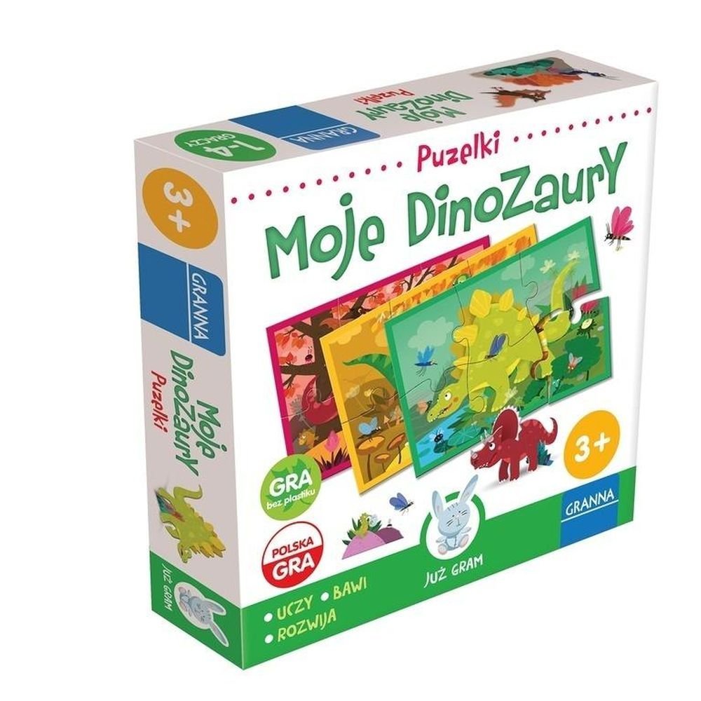 Wybierz po jednym elemencie każdego z dinozaurów. Podziel je między uczestników gry. Pozostałe elementy odwróć obrazkami do dołu. Odkrywajcie je po kolei. Kto pierwszy ułoży swojego dinozaura wygra.